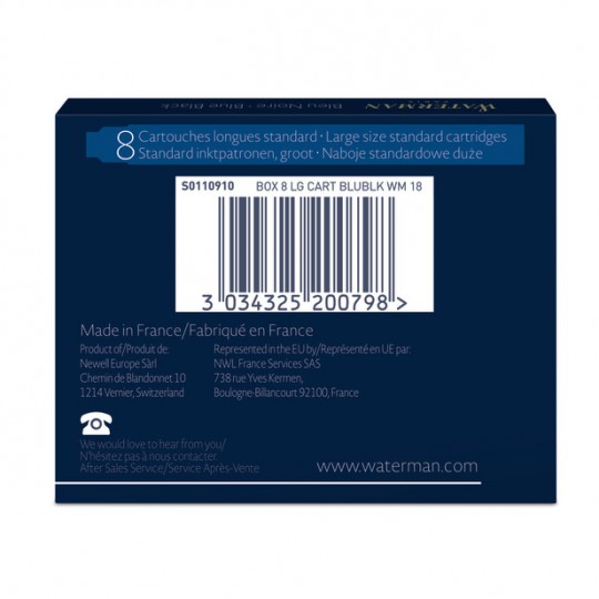 Naboje do piór znanej oraz cenionej marki Waterman. To naboje, które stworzone zostały specjalnie do wszystkich piór wiecznych marki Waterman, niezależnie od serii. Pasują do nich idealnie, zapewniając maksimum komfortu podczas użytkowania oraz najlepsze parametry techniczne. Naboje pakowane są po 8 sztuk do papierowych opakowań. To standardowe produkty w granatowym kolorze, który pięknie prezentuje się na papierze. Dzięki specjalnie opracowanej technologii atrament doskonale przepływa z naboju do stalówki, kreśląc estetyczne napisy. Wybór opakowania zawierającego 8 sztuk zapewnia długie i bezproblemowe pisanie, ponieważ atrament nie zasycha wewnątrz naboju.Specyfikacja