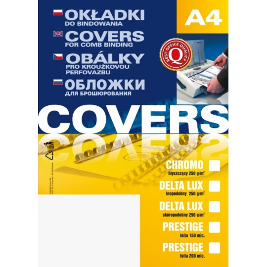 jednostronnie kolorowy, błyszczący karton do oprawy dokumentów oprawa dokumentów w formacie A4 gramatura 250 g/m2 laminowany folią dostępne kolory: biały, żółty, czerwony, zielony, niebieski, czarny jednostka sprzedaży: 1 opakowanie : 100 sztuk do oprawy drutowej i plastikowejSpecyfikacja