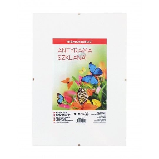 Antyrama o wymiarach 21x29.7cm wykonana ze szlifowanego szkła o grubości 2mm Idealna do ekspozycji zdjęc, obrazów, dyplomów, plakatów. -Obustronnie oklejona folią ochronną -Płyta HDF o grubości 3mm chroni przed uszkodzeniami -Boki pomalowane na białoSpecyfikacja