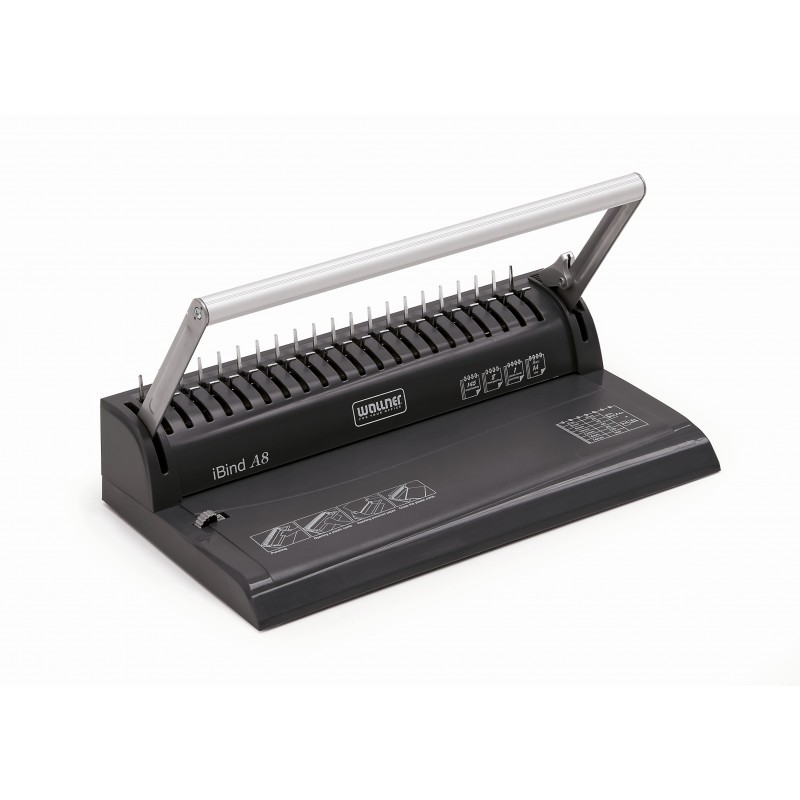 bindownica do grzbietów plastikowych wygodna dźwignia do dziurkowania ogranicznik papieru ułatwiający precyzyjne wyśrodkowanie papieru jednorazowe dziurkowanie do 8 arkuszy papieru oprawa dokumentów o objętości do 145 kartek formatu A4 pojemnik na ścinkiSpecyfikacja