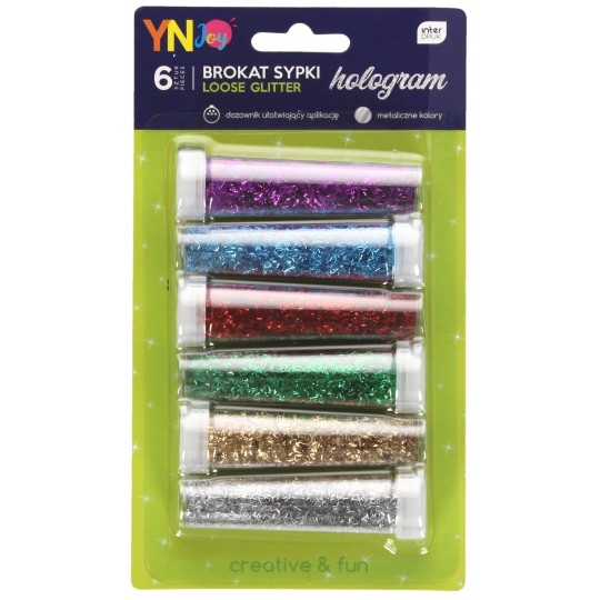 Brokat sypki 7g 6 kolorów hologram Zestaw zawiera brokat w kolorze: -zielonym -niebieskim -fioletowym -złotym -srebrnym -czerwonymSpecyfikacja