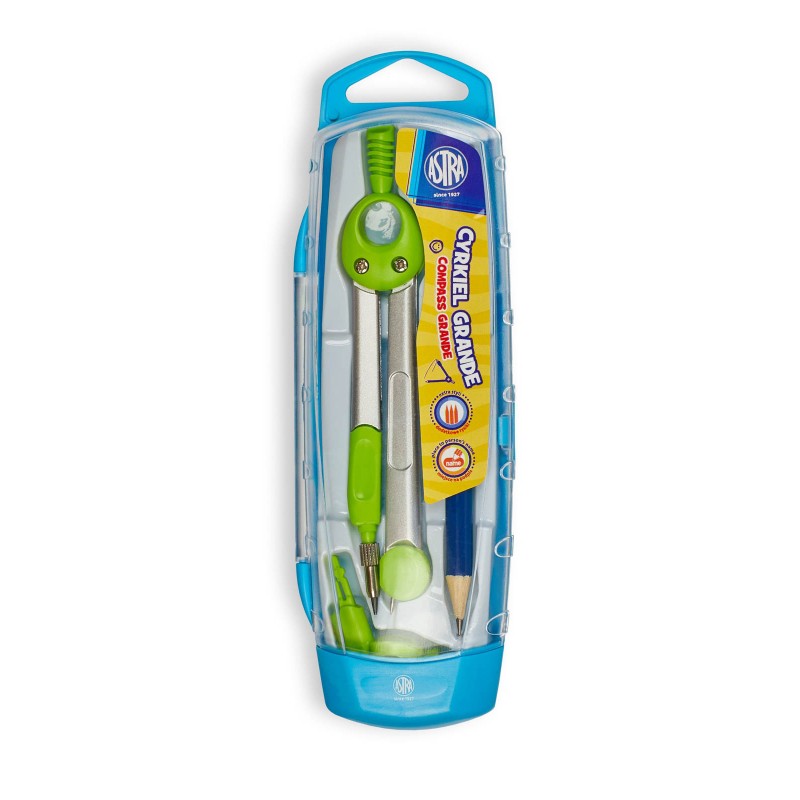 Cyrkiel Astra z metalicznymi ramionami i miejscem na wpisanie imienia. Zestaw zawiera cyrkiel, ołówek, dodatkowe rysiki oraz uchwyt na ołówek. Dodatkowo znajduje się w poręcznym i praktycznym etui. Kolor wysyłany losowo!Specyfikacja