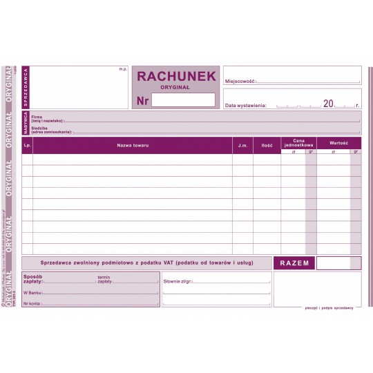 RACHUNEK DLA ZWOLNIONYCH PODMIOTOWO format: A5 (poziom) rodzaj papieru: samokopiujący zastosowanie: rachunki i inne dowody sprzedaży oprawa: bloczek 80 kartek druk: jednostronny (oryginał + kopia)Specyfikacja