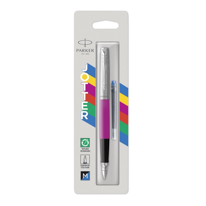Klasyczne pióro wieczne Parkera w zupełnie nowej odsłonie. To pióro wieczne, które w dłoni trzyma kolejne pokolenie użytkowników piór wiecznych. Zmieniają się kolory i detale wykończenia, ale niezmienne pozostają znaki rozpoznawcze Parkera - najwyższa jakość produktów w stosunkowo korzystnej cenie. Atrakcyjny kolor połączony jest z charakterystycznymi dla marki Parker kształtem pióra wiecznego oraz klipem w kształcie strzały. To prawdziwe symbole marki Parker, rozpoznawane na całym świecie! Klasyka wzbogacona szczyptą fantazji. Wyróżnij się dzięki pięknej barwie pióra wiecznego Parker Jotter. Zaskocz otoczenie ciekawym kolorem swojego pióra wiecznego. Profil korpusu pióra wiecznego jest dopasowany do estetyki długopisów Jotter, można stworzyć zestaw. Zaokrąglone elementy wykończenia dają wrażenie subtelności. Stalówka zdobiona grafiką z 3 strzałkami. Pióro wieczne wykonane z wysokiej jakości tworzywa sztucznego w kolorze magenta. Skuwka i klip ze stali nierdzewnej. Część przednia z czarnego tworzywa a stalówka wykonana ze stali nierdzewnej. Pióro wieczne jest zawsze zapakowane w opakowanie Parker. UWAGA: W zestawie jest nabój, który jest umieszczony w opakowaniu.Specyfikacja