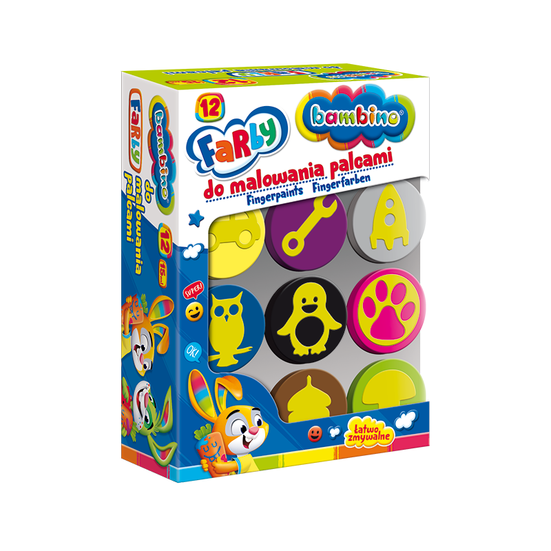 Farby do malowania palcami -łatwo zmywalne -nieszkodliwe -mogą być stosowane bez użycia wody -idealnie rozprowadzają się na papierze, kartonie czy brystolu -każdy pojemniczek posiada wieczko ze stempelkiem -spełniają wymagania zasadnicze dyrektywy Parlamentu Europejskiego i Rady 2009/48/WE z dnia 18 czerwca 2009 w sprawie bezpieczeństwa zabawek oraz wymogi odpowiednich norm zharmonizowanych -ilość kolorów - 12 -słoiczki o pojemności 15 mlSpecyfikacja
