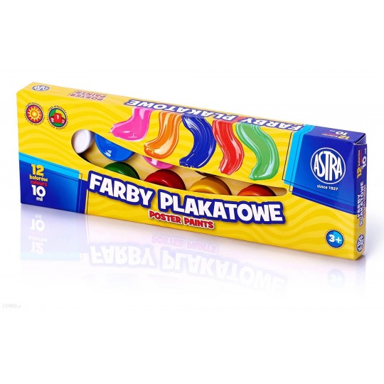 -Farby plakatowe Astra w 12 kolorach. Zestaw farb plakatowych w słoiczkach o pojemności 10ml. -Farby plakatowe idealne do szkoły na zajęcia plastyczne. -Farby kryjące do malowania na: papierze, drewnie, ceramice, kamieniu, styropianie. Gęstą farbę zaleca się rozcieńczyć z wodą. -W zestawie kolory: czarny, biały, żółty, niebieski, czerwony, zielony, brązowy, różowy, jasny niebieski, jasny zielony, pomarańczowy, jasny brązowy.Specyfikacja