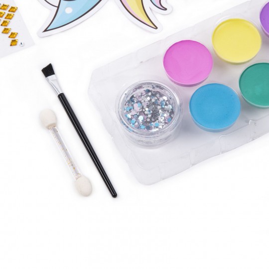 Stwórz wyjątkową stylizację razem z KIDEA! Zestaw Unicorn pozwoli wykonać super charakteryzację! Cały komplet zawiera, aż 10 elementów: opaska z rogiem jednorożca z gumką, szablon, farbki do twarzy w 6 odcieniach – różowym, żółtym, fioletowym, niebieskim, granatowym i białym, cekiny oraz brokat. Wszystkie produkty są bezpieczne, co potwierdziły restrykcyjne testy laboratoryjne. Z tyłu opakowania instrukcja jak krok po kroku stworzyć wybraną stylizację. Stwórz spektakularny makijaż razem z KIDEA, od którego wszyscy nie będą mogli oderwać wzroku!Specyfikacja