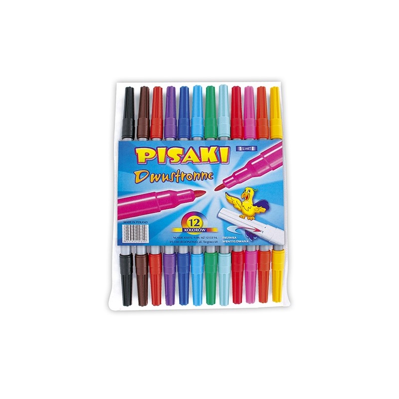 Pisaki Kamet dwustronne w zestawe 12 kolorów Atrament na bazie wody zmywalny z większości tekstyliów Dwie szerokości pisania 1-1,5mm i 1,5-4mm Długość linii pisania powyżej 900 m Nietoksyczne, wentylowana skuwka. Obudowa z PP zatrzymującego wilgoć dzięki czemu mają długi okres trwałości, ergonomiczna obudowa zapewnia swobodę pisania, Mocna i odporna na nacisk końcówka fibrowa Potwierdzona zgodność z normą PN-EN 71-3.Specyfikacja