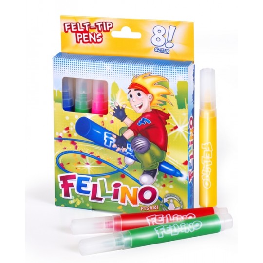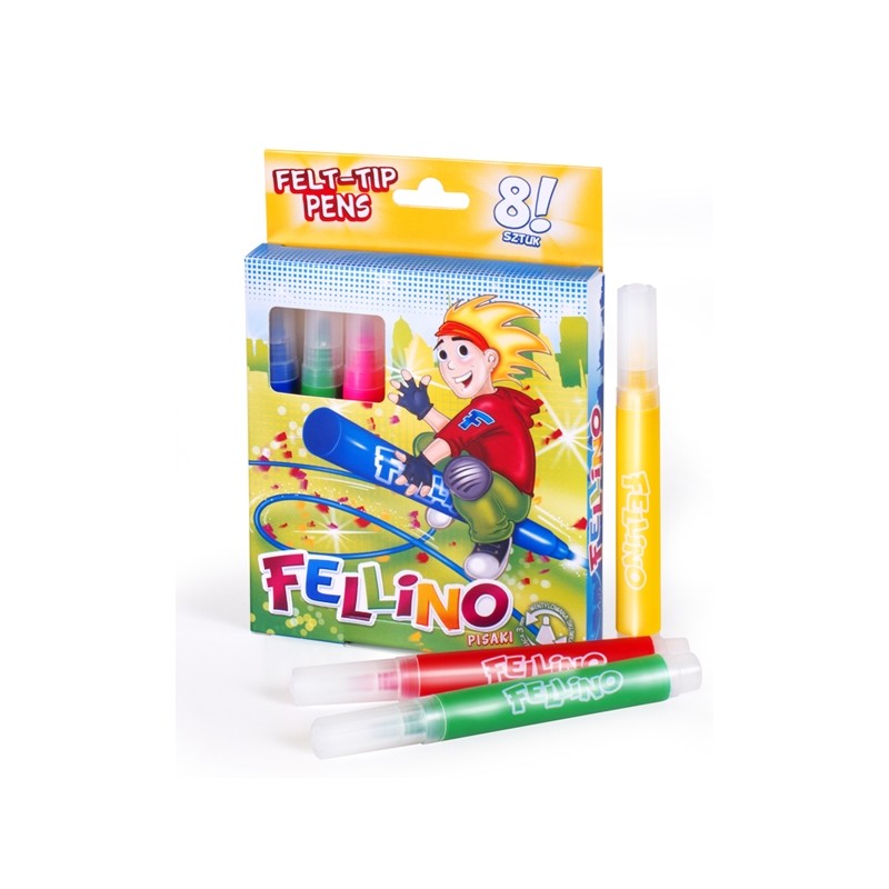 Zestaw pisaków Kamet Fellino- 8 szt. Super kolorowe, grube pisaki z atramentem na bazie wody, zmywalnym z większości tekstyliów. Nietoksyczne, bezpieczne dla dzieci. Szerokość pisania: 2mm -3mm Długość linii pisania: 1400mSpecyfikacja