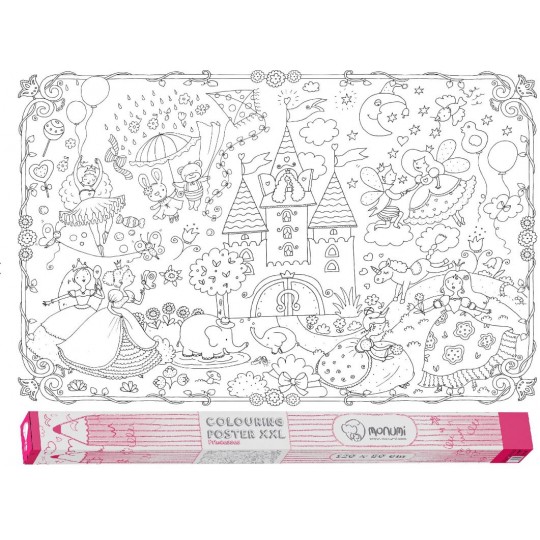 Kolorowanka podłogowa XXL "Princesses" 120x80cm Ogromna powierzchnia do kolorowania kredkami, flamastrami i farbami Kolorowanka wykonana jest z grubego kartonu (podobnego do brystolu), który można bez końca rozkładać i zwijać Wzmocniony spód arkusza zabezpiecza przed przesiąkaniem farb Przygotowane ilustracje ćwiczą spostrzegawczość, a duża powierzchnia umożliwia wspólne rysowanie kilkorgu dzieciom jednocześnie Wygodne opakowanie w formie tuby zabezpiecza kolorowankę i ułatwia transport Wiek: 5+ Wymiary: 120 x 180 cm Wymiary opakowania: 7 x 82 x 7 cm Waga z opakowaniem: 0,4 kgSpecyfikacja