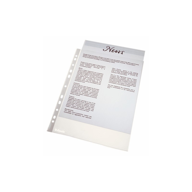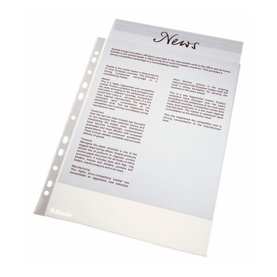 Koszulki do codziennego użytku. Pasek z multi-perforacją pozwala na wygodne przechowywanie dokumentów we wszystkich rodzajach segregatorów. Podlegająca recyklingowi, groszkowa folia PP o grubości 0,043 mm, copysafe Otwierane od góry, co zapewnia łatwe wyciąganie dokumentów, bez konieczności wyjmowania ich z segregatora 11 uniwersalnych otworów na pasku umożliwiających wpięcie w każdy segregator Format A4Specyfikacja