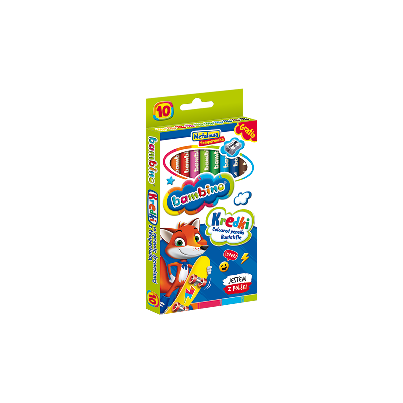 -Wykonane z glinki kaolinowej. -W drewnianej oprawie. -Produkowane w Polsce. -Łatwe do temperowania. -Miękkie w użyciu. -Intensywne i nasycone kolory. -Doskonale kryją powierzchnię. -Idealne do rysowania, wypełniania dużych płaszczyzn i wykonywania miękkich przejść pomiędzy kolorami. -Grube, odpowiednio wyważone, przez co idealnie dopasowują się do małej dłoni dziecka. -Odpowiednie dla dzieci 3+. -Spełniają wymagania zasadnicze dyrektywy Parlamentu Europejskiego i Rady 2009/48/WE z dnia 18 czerwca 2009 w sprawie bezpieczeństwa zabawek oraz wymogi odpowiednich norm zharmonizowanych -10 kolorów. -Temperówka w zestawie.