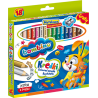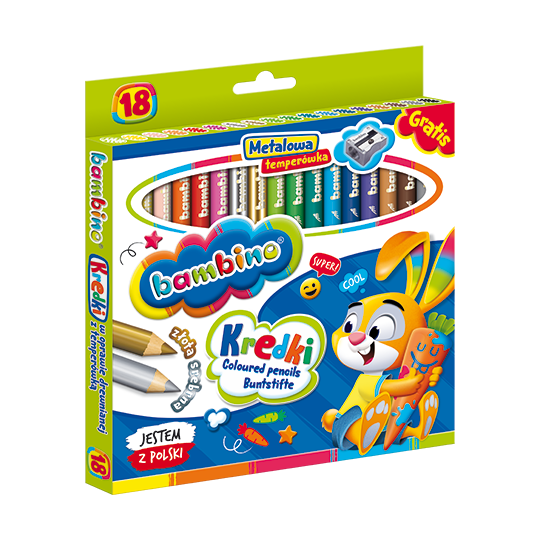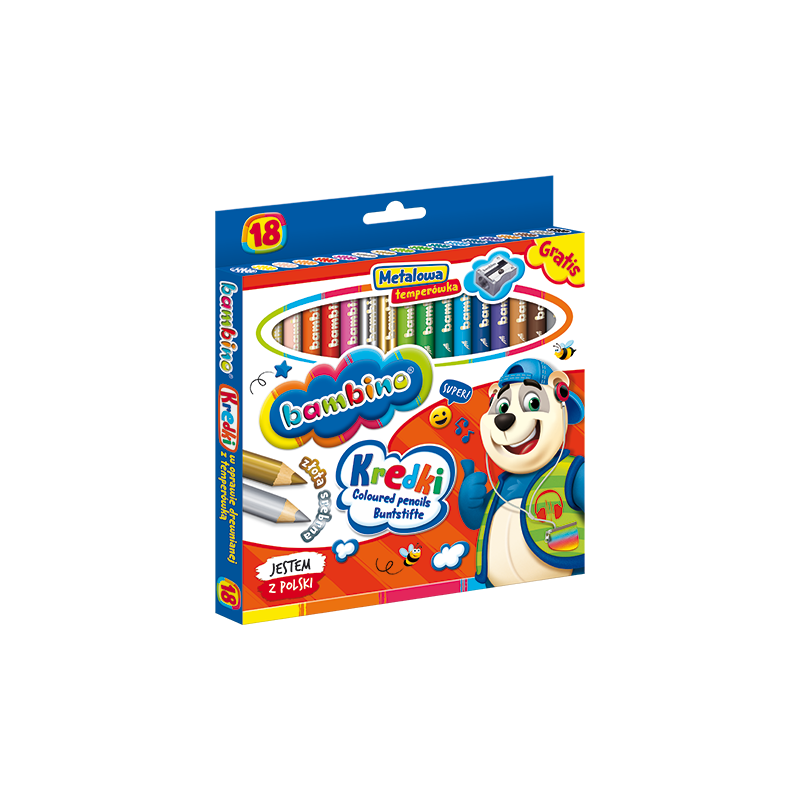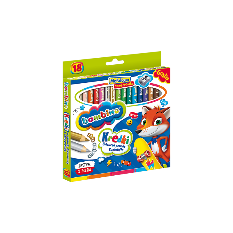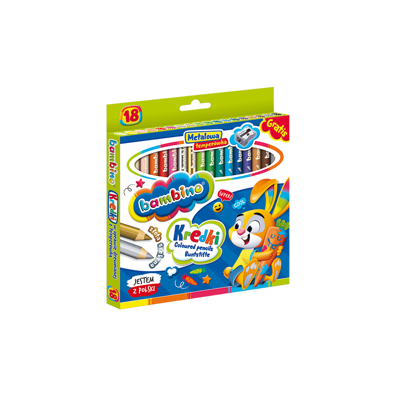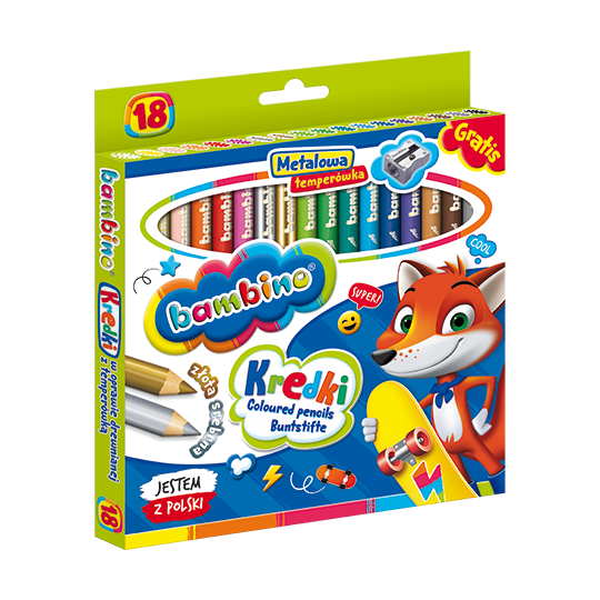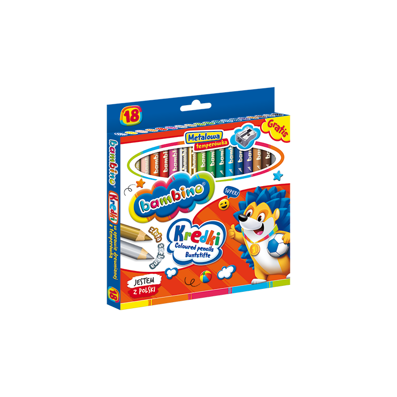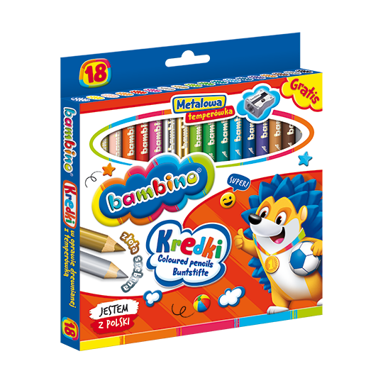 wykonane z glinki kaolinowej w drewnianej oprawie produkowane w Polsce łatwe do temperowania miękkie w użyciu Intensywne i nasycone kolory -doskonale kryją powierzchnię -idealne do rysowania, wypełniania dużych płaszczyzn i wykonywania miękkich przejść pomiędzy kolorami -grube, odpowiednio wyważone, przez co idealnie dopasowują się do małej dłoni dziecka -odpowiednie dla dzieci 3+ -spełniają wymagania zasadnicze dyrektywy Parlamentu Europejskiego i Rady 2009/48/WE z dnia 18 czerwca 2009 w sprawie bezpieczeństwa zabawek oraz wymogi odpowiednich norm zharmonizowanych -18 kolorów -temperówka w zestawie -w zestawie złota i srebrna kredka -Specyfikacja produktu: -Przekrój kredki - 10 mm -Długość kredki - 15 cm -Średnica pręcika – 5,3 mm