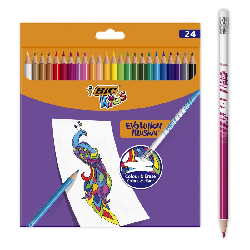 BIC Kids Evolution Illusion Kredki ołówkowe • Kredka wymazywalna o średniej szerokości • Idealna do rysowania i kolorowania dla dzieci powyżej 5 lat • Produkt najwyższej Jakości • Pozwala dzieciom na łatwe poprawianie swoich prac artystycznych lub szkolnych • Dostępna w 24 żywych Kolorach • Grafi t odporny na Złamania • Dobrze kryjący grafit o szerokości 2,8 mm na bazie pigmentówSpecyfikacja