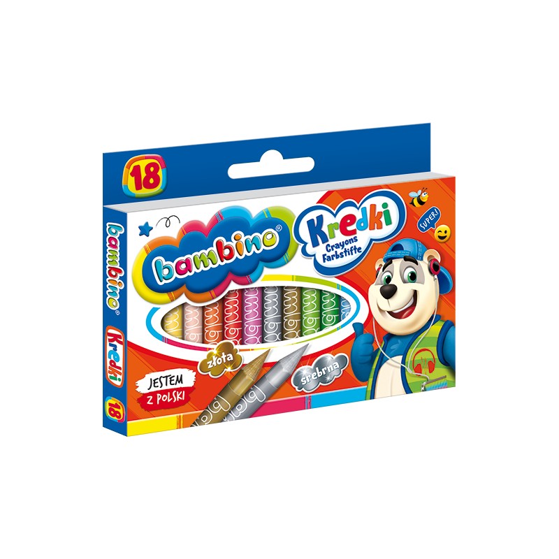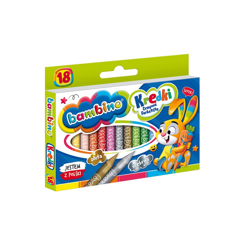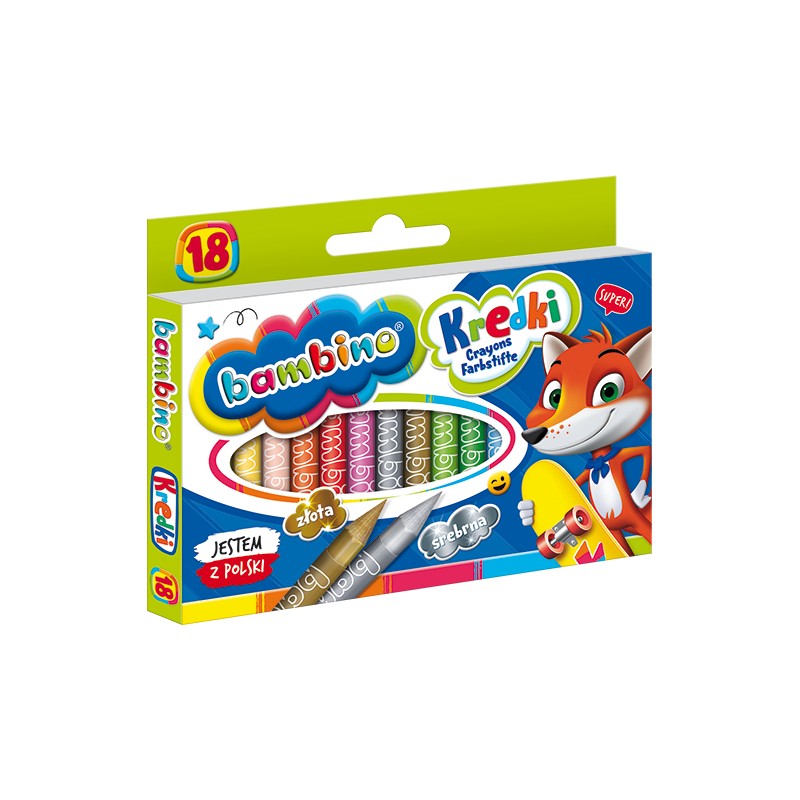 "Cechy produktu: kredki, które towarzyszą dzieciom od pokoleń produkowane w Polsce wykonane są z glinki kaolinowej, co nieporównywalnie podnosi ich walory użytkowe względem kredek świecowych, woskowych czy ołówkowych intensywne i nasycone kolory doskonale kryjące powierzchnię idealne do rysowania, wypełniania dużych płaszczyzn i wykonywania miękkich przejść pomiędzy kolorami każda kredka posiada papierową ochronną owijkę z indywidualnym motywem graficznym ułatwiającym naukę i rozpoznawanie kolorów (na każdej kredce inne zwierzątko) odpowiednie dla dzieci 3+ spełniają wymagania zasadnicze dyrektywy Parlamentu Europejskiego i Rady 2009/48/WE z dnia 18 czerwca 2009 w sprawie bezpieczeństwa zabawek oraz wymogi odpowiednich norm zharmonizowanych 18 kolorów"