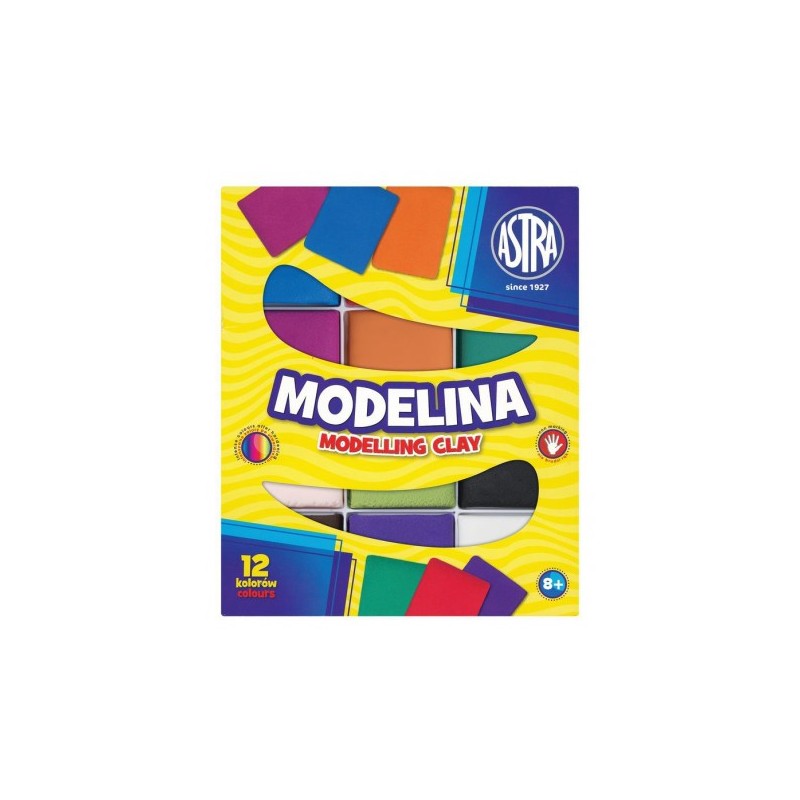 Modelina 12 kolorów Astra Modelina jest wysokiej jakości termoutwardzalnym tworzywem plastycznym. Doskonale nadaje się do tworzenia modeli oraz makiet. Z modeliny można także wyrabiać drobną galanterię: klipsy, broszki, breloczki. Modele można wykonywać ręcznie lub przez wyciskanie wzorów w formach. Twarda modelina mięknie pod wpływem ciepła dłoni. Modele należy utwardzać przez wygrzewanie w piekarniku w temperaturze 100–110°C w ciągu 15–20 minut. Gotowe modele posmarowane olejem roślinnym nabierają żywszych barw.Specyfikacja