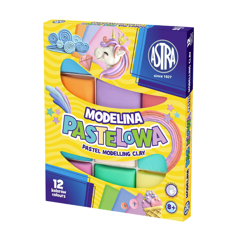 Modelina Pastelowa 12 kolorów Astra Modelina jest wysokiej jakości termoutwardzalnym tworzywem plastycznym. Doskonale nadaje się do tworzenia modeli oraz makiet. Z modeliny można także wyrabiać drobną galanterię: klipsy, broszki, breloczki. Modele można wykonywać ręcznie lub przez wyciskanie wzorów w formach. Twarda modelina mięknie pod wpływem ciepła dłoni. Modele należy utwardzać przez wygrzewanie w piekarniku w temperaturze 100–110°C w ciągu 15–20 minut. Gotowe modele posmarowane olejem roślinnym nabierają żywszych barw. -12 pastelowych kolorówSpecyfikacja