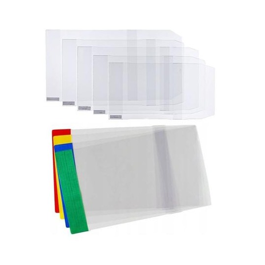 Okładka na zeszyt do nut A5 KALPI regulowana 1szt. (210mm x 310mm) Przezroczysta okładka z kolorowymi zakładkami. Regulowana szerokość pozwala na doskonałe dopasowanie okładki na pionowych rantach książki, także grubszej książki. Materiały użyte w produkcji i technologia produkcji okładek z regulowaną szerokością są takie same, jak w przypadku ich odpowiedników o stałej szerokości. Rożnica tkwi w konstrukcji – okładki o regulowanej szerokości posiadają zwężający się u końcowi „wąs”, który należy zagiąć przy końcu okładki książki i jego koniec założyć za kolorowy pasek boczny. Format: A5 Kolor wysyłany losowoSpecyfikacja