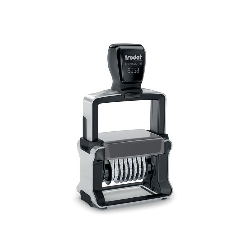 8-cyfrowy numerator 5558/PL z płytką tekstową. Maksymalny rozmiar płytki 56 x 33 mm. Wysokość czcionki 5 mm. Najbardziej wytrzymała pieczątka biurowa Trodat Professional - gwarancja 400 000 odbić. Posiada metalowy szkielet oraz bardzo mocną, stalową obudowę. Idealana do urzędów, banków, instytucji i wszędzie tam gdzie stempluje sie dużo dokumentów. Idealnie dopracowany mechanizm stempluje lekko i bez wysiłku.Wymienna wkładka z wygodnym uchwytem - gwarantuje czyste ręce przy wymianie. Wyprodukowana z materiałów odzyskanych oraz przy zmniejszonej emisji CO2.Specyfikacja