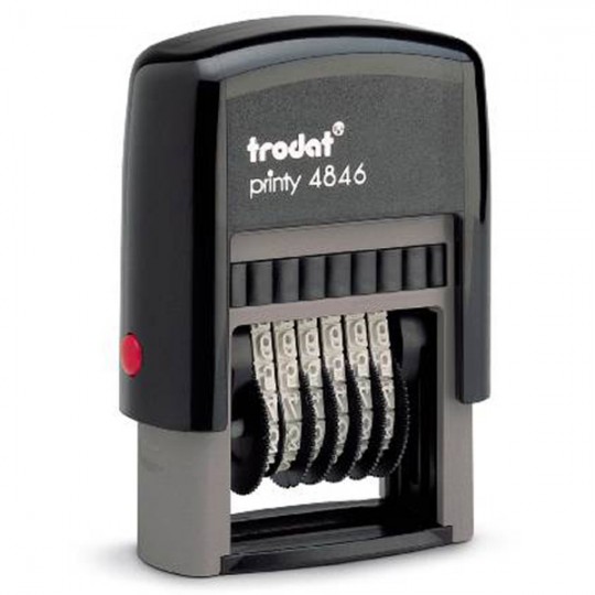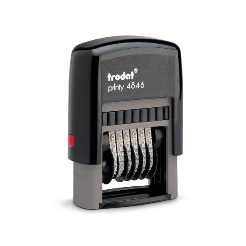 Numerator samotuszujący Trodat Printy 4846. Ilość cyfr 6, wysokość czcionki 4 mm Obudowa wyprodukowana z odzyskanego plastiku oraz przy zmniejszonej emisji CO2. Przydatny do znakowania dokumentów w każdym biurze.Specyfikacja