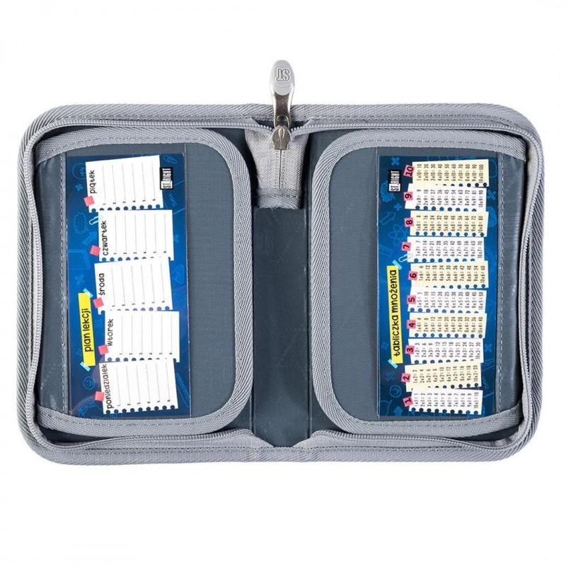 Funkcjonalność: pojedynczy piórnik z dwiema klapkami zamykany za pomocą zamka błyskawicznego ergonomicznie wyprofilowany, solidny uchwyt do suwaka posiada przegrody i liczne mocowania ułatwiające organizację przyborów szkolnych Wymiary: wysokość: 20,5 cm szerokość: 14 cm głębokość: 3,5 cmSpecyfikacja
