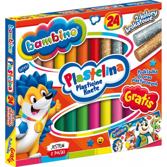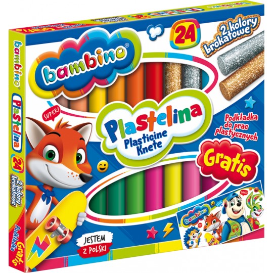 Plastelina BAMBINO, 24 kolory -elastyczna, łatwo się modeluje -intensywne, żywe kolory -nie przywiera do podłoża -nie brudzi rąk -pozwala na tworzenie prac metodą millefiori -bezpieczna dla dzieci -spełnia wymagania zasadnicze dyrektywy Parlamentu Europejskiego i Rady 2009/48/WE z dnia 18 czerwca 2009 w sprawie bezpieczeństwa zabawek oraz wymogi odpowiednich norm zharmonizowanych -ilość kolorów: 24 -waga laseczki plasteliny: 15 gSpecyfikacja