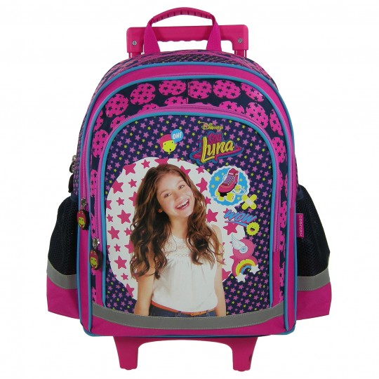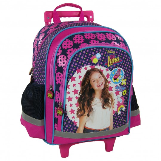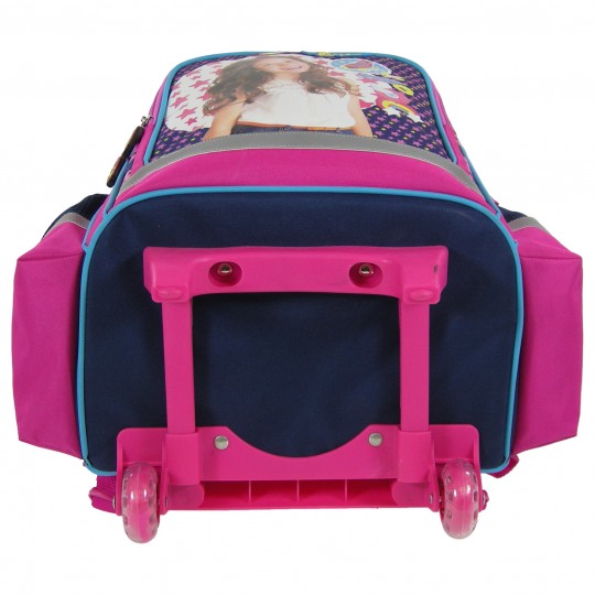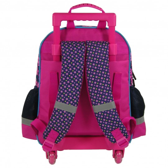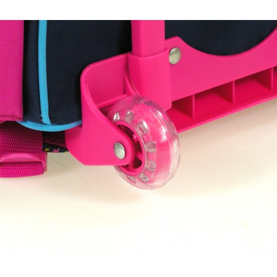Plecak szkolny na kółkach. Posiada dwie komory zapinane na zamek dwukierunkowy, ozdobne pullery oraz dużą kieszeń przednią. Ma regulowane szelki, usztywnione dno oraz uchwyt do przenoszenia plecaka. Dodatkowe zalety plecaka to duży odblask zwiększający bezpieczeństwo dziecka na drodze.Specyfikacja