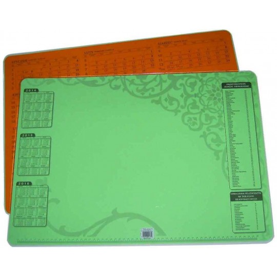 • Wymiary ~630x445 mm. • Kolor-mix kolorów • Podkład wykonany jest z przezroczystej folii o grubości 0,3 mm. Wewnątrz umieszczona wymienna wkładka z kolorowym nadrukiem. • Wkładka z zaokrąglonymi rogami, wykonana z kartonu o gramaturze 180 g/m2 barwionego w masie. • Na całej powierzchni tyłu znajduje się duża, wygodna kieszeń, która została wykonana z przezroczystej folii o grubości 0,3 mm. • Na jednej stronie podkładu znajdują się kalendarze na trzy lata (poprzedni rok, bieżący rok, przyszły rok), a także międzymiastowe numery kierunkowe oraz oznaczenia województw na tablicach rejestracyjnych pojazdów. • Na drugiej stronie podkładu znajduje się duży kalendarz na rok bieżący wraz z imieninami. • Po obu stronach podkładu, na samym dole, znajduje się linijka. • Podkład może być używany jako podkładka pod mysz komputerową. • Towar wysyłany losowoSpecyfikacja