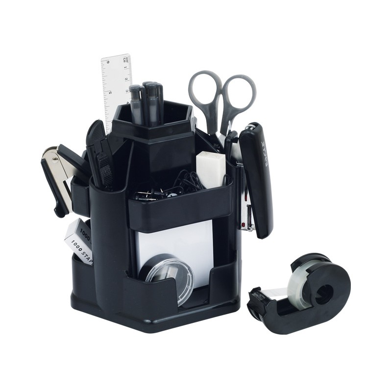 Obrotowy. W zestawie: – zszywacz – rozszywacz – nożyczki – nóż do papieru – temperówka – gumka do ścierania – linijka 15 cm – długopisy (4 szt.) – pinezki tablicowe (20 szt.) – spinacze (30 szt.) – zszywki #10 (1 opak.) – taśma klejąca 12×10 z uchwytem – notes 63×63 mm – wymiary: 150 x 135 x 145 mmSpecyfikacja