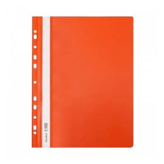 Skoroszyt Twardy Zawieszany -folia PVC, przód twardy przezroczysty, tył twardy kolorowy -boczna perforacja umożliwia wpięcie do segregatora z dowolnym ringiem- -w środku blaszka i wąs o długości 16,5 cm, umożliwiający wpięcie dokumentów do 2 cm -wymienny papierowy pasek do opisu z kodem kreskowym na szt. -dwa wycięcia ułatwiające wysuwanie paska -zaokrąglone rogi obu okładek -Do Formatu A4