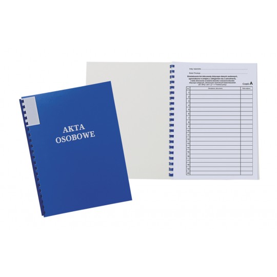 • Wymiary ~230x310 mm. • Okładka drukowana, lakierowana wykonana ze sztywnego i mocnego kartonu o gramaturze minimum 250 g/m2. • Binda wewnętrzna (fi 10 mm). • Grzbiet o szerokości ok. 10 mm. • Na grzbiecie dołączona jest tekturka z miejscem na dane personalne. • Blok składa się z kart A, B, C, D wykonanych z papieru offsetowego o gramaturze 170 g/m2 zawierających tabele z treścią według wzoru Kodeksu Pracy: - część A - dokumenty zgromadzone w związku z ubieganiem się o zatrudnienie, a także skierowanie na badania i orzeczenia lekarskie; - część B - dokumenty dotyczące nawiązania stosunku pracy oraz przebiegu zatrudnienia pracownika; - część C - dokumenty związane z rozwiązaniem albo wygaśnięciem stosunku pracy; - część D - dokumenty związane z ponoszeniem przez pracownika odpowiedzialności. • Na kartonowych przekładkach blaszki i wąsy do wpinania dokumentów pracownika. • Sposób wykonania grzbietu pozwala na wygodne wpinanie dokumentów i wpisywanie danych. • Teczki wykonane według aktualnie obowiązujących przepisów Kodeksu Pracy.Specyfikacja