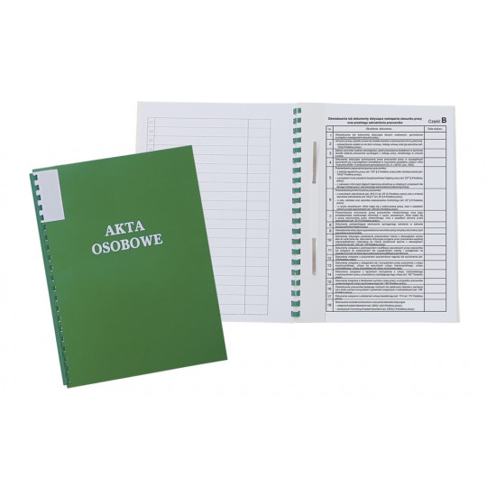 • Wymiary ~230x310 mm. • Okładka drukowana, lakierowana wykonana ze sztywnego i mocnego kartonu o gramaturze minimum 250 g/m2. • Binda wewnętrzna (fi 10 mm). • Grzbiet o szerokości ok. 10 mm. • Na grzbiecie dołączona jest tekturka z miejscem na dane personalne. • Blok składa się z kart A, B, C, D wykonanych z papieru offsetowego o gramaturze 170 g/m2 zawierających tabele z treścią według wzoru Kodeksu Pracy: - część A - dokumenty zgromadzone w związku z ubieganiem się o zatrudnienie, a także skierowanie na badania i orzeczenia lekarskie; - część B - dokumenty dotyczące nawiązania stosunku pracy oraz przebiegu zatrudnienia pracownika; - część C - dokumenty związane z rozwiązaniem albo wygaśnięciem stosunku pracy; - część D - dokumenty związane z ponoszeniem przez pracownika odpowiedzialności. • Na kartonowych przekładkach blaszki i wąsy do wpinania dokumentów pracownika. • Sposób wykonania grzbietu pozwala na wygodne wpinanie dokumentów i wpisywanie danych. • Teczki wykonane według aktualnie obowiązujących przepisów Kodeksu Pracy.Specyfikacja