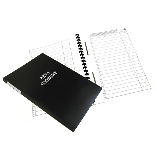 • Wymiary ~238x310 mm. • Okładka drukowana, lakierowana wykonana ze sztywnego i mocnego kartonu o gramaturze minimum 250 g/m2. • Binda wewnętrzna (fi 14 mm). • Grzbiet o szerokości ok. 14 mm. • Na grzbiecie miejsce na dane personalne. • Blok składa się z kart A, B, C, D wykonanych z papieru offsetowego o gramaturze 170 g/m2 zawierających tabele z treścią według wzoru Kodeksu Pracy: - część A - dokumenty zgromadzone w związku z ubieganiem się o zatrudnienie, a także skierowanie na badania i orzeczenia lekarskie; - część B - dokumenty dotyczące nawiązania stosunku pracy oraz przebiegu zatrudnienia pracownika; - część C - dokumenty związane z rozwiązaniem albo wygaśnięciem stosunku pracy; - część D - dokumenty związane z ponoszeniem przez pracownika odpowiedzialności. • Na kartonowych przekładkach blaszki i wąsy do wpinania dokumentów pracownika. • Sposób wykonania grzbietu pozwala na wygodne wpinanie dokumentów i wpisywanie danych. • Teczki wykonane według aktualnie obowiązujących przepisów Kodeksu Pracy.Specyfikacja