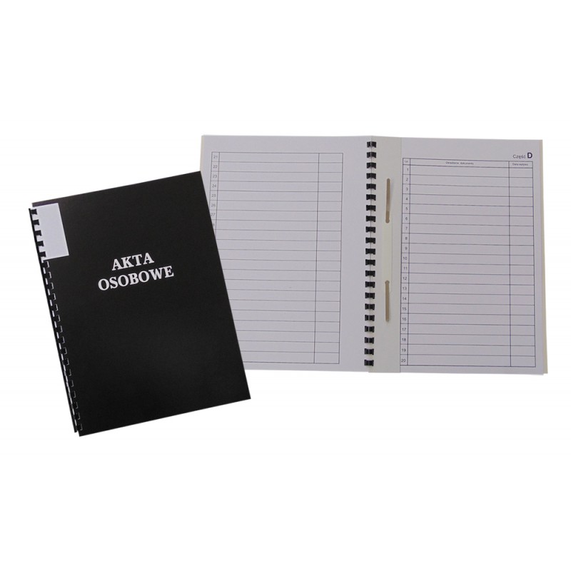 "• Wymiary ~230x310 mm. • Okładka drukowana, lakierowana wykonana ze sztywnego i mocnego kartonu o gramaturze minimum 250 g/m2. • Binda wewnętrzna (fi 10 mm). • Grzbiet o szerokości ok. 10 mm. • Na grzbiecie dołączona jest tekturka z miejscem na dane personalne. • Blok składa się z kart A, B, C, D wykonanych z papieru offsetowego o gramaturze 170 g/m2 zawierających tabele bez treści. • Na kartonowych przekładkach blaszki i wąsy do wpinania dokumentów pracownika. • Sposób wykonania grzbietu pozwala na wygodne wpinanie dokumentów i wpisywanie danych. • Teczki wykonane według aktualnie obowiązujących przepisów Kodeksu Pracy."Specyfikacja