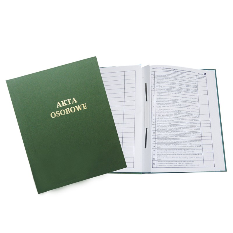 • Wymiary ~250x315 mm. • Okładka twarda, oklejana, ze sztywnym grzbietem. • Okleina okładki typu Geltex. • Grzbiet o szerokości ok. 12 mm. • Blok składa się z kart A, B, C, D wykonanych z papieru offsetowego o gramaturze 170 g/m2 zawierających tabele z treścią według wzoru Kodeksu Pracy: - część A - dokumenty zgromadzone w związku z ubieganiem się o zatrudnienie, a także skierowanie na badania i orzeczenia lekarskie; - część B - dokumenty dotyczące nawiązania stosunku pracy oraz przebiegu zatrudnienia pracownika; - część C - dokumenty związane z rozwiązaniem albo wygaśnięciem stosunku pracy; - część D - dokumenty związane z ponoszeniem przez pracownika odpowiedzialności. • Na kartonowych przekładkach blaszki i wąsy do wpinania dokumentów pracownika. • Sposób wykonania grzbietu pozwala na wygodne wpinanie dokumentów i wpisywanie danych. • Teczki wykonane według aktualnie obowiązujących przepisów Kodeksu Pracy.Specyfikacja