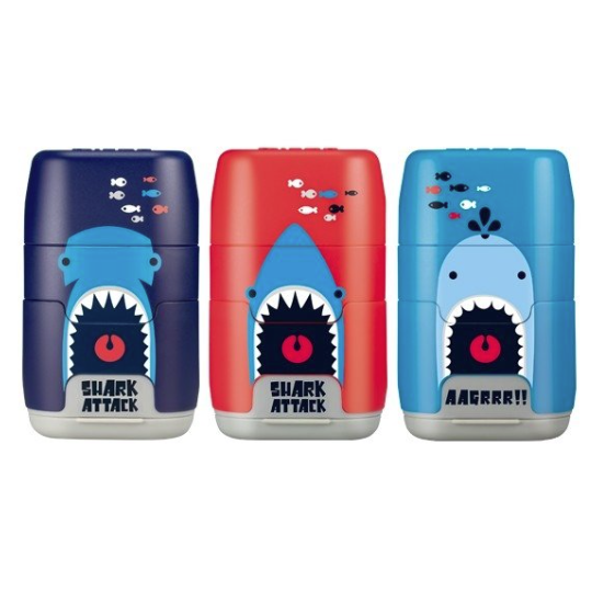 Temperówka podwójna z gumką do mazania Milan Shark Attack -Temperówka na dwie grubości ołówków i kredek. -Posiada pojemnik na odpadki oraz gumkę. -Ostrza z karbonu. -Miękka gumka syntetyczna - Milan 430 (możliwość dokupienia zapasowej). -Wymiary: 6,7x4x2,5cm -Mix kolorów - wysyłamy losowo.Specyfikacja