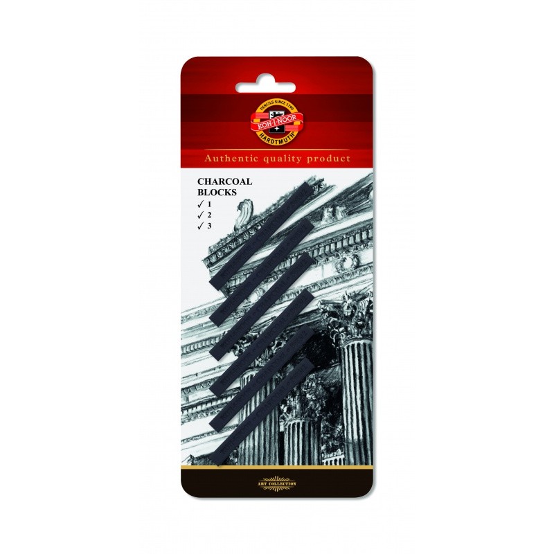 Węgiel prasowany w sztyfcie o wymiarach 7x7x70 mm. Pozwala uzyskać równą, gładką i intensywnie czarną linię. Powstaje przez uformowanie z wypalonej mieszanki węgla drzewnego i gliny. Zestaw zawiera 6 sztuk, po 2 sztuki z twardości: 1, 2, 3.Specyfikacja