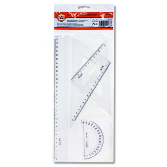 Zestaw wykonany z przezroczystego tworzywa sztucznego. Linijka i ekierki mają podcięcia pomocne przy kreśleniu tuszem. -Zestaw zawiera: - Linijkę 30 cm -Ekierkę równoramienną 16 cm -Ekierkę prostokątną 22 cm -Kątomierz 180Specyfikacja