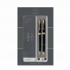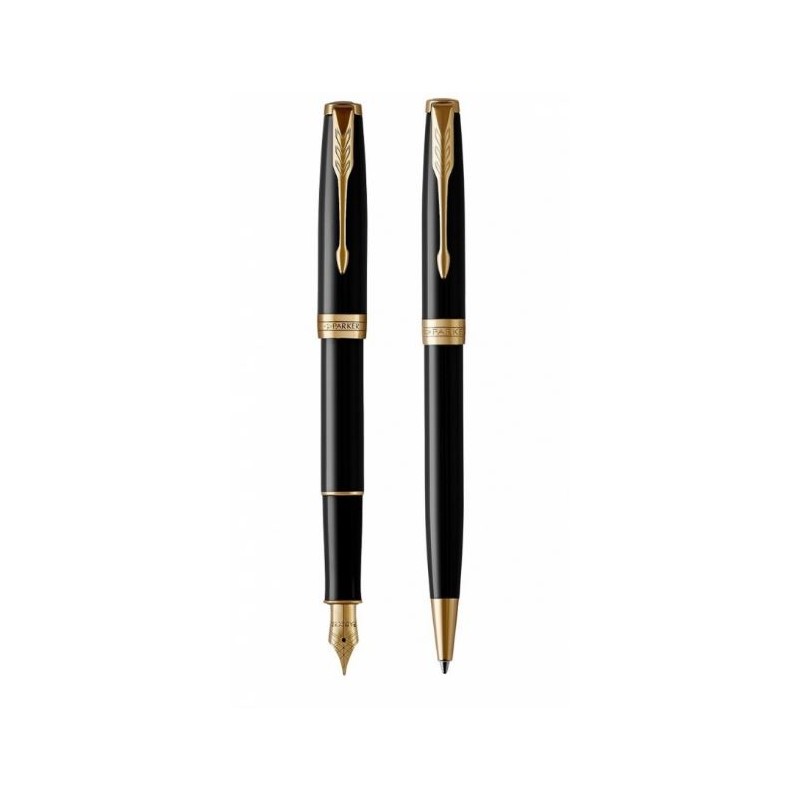 Parker Sonnet Black Laquer GT, czarny ze złotymi wykończeniami, zestaw podwójny pióro wieczne i długopis, stalówka medium, czarny atrament, zestaw prezentowy Podaruj wyrafinowany prezent w postaci zestawu pióra wiecznego i długopisu PARKER Sonnet. Każdy element zestawu posiada korpus i nasadkę pokryte czarnym lakierem i klip oraz pierścienie wykończone złotem. Mogąc wybrać spośród pióra wiecznego i długopisu Parker, osoba pisząca zapewni sobie swobodę wyboru sposobu pisania w danej sytuacji. Opis produktu: Odkryj luksusowe połączenie pióra wiecznego i długopisu Sonnet Wyraz prawdziwej elegancji, ręcznie składane, z nasadką i korpusem pokrytym czarnym lakierem oraz z klipem i pierścieniami wykończonymi złotem Pióro wieczne wyposażone jest kunsztownie wykonaną stalówkę zapewniającą doświadczenie precyzyjnego, komfortowego pisania Długopis z mechanizmem obrotowym wyposażony jest we wkład QuinkFlow zapewniający optymalny dopływ tuszu i gładkie pisanie Wyrafinowany prezent w przystępnej cenie. Zestaw podwójny dostępny jest w opakowaniu prezentowym PARKER z niebieskimi wkładami w zestawieSpecyfikacja
