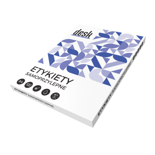 Etykiety Desk samoprzylepne do drukarek - format A4. - kolor: biały. - opakowanie zawiera 100 arkuszy A4. - wymiary etykiety: 210mm x 297mm. - wykonane są z papieru w formie samoprzylepnej. Współpracują ze wszystkimi rodzajami drukarek igłowych, atramentowych i z większością drukarek laserowych.Specyfikacja