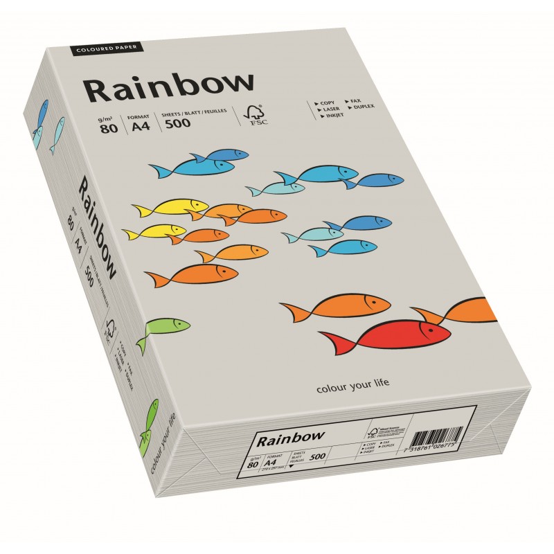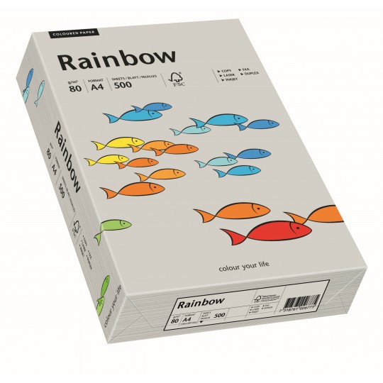 Papier ksero kolorowy Rainbow, /96/ szary, A4, 80 g, inspirujący asortyment bezdrzewnego, barwionego w masie papieru niepowlekanego w szerokiej gamie kolorystycznej dedykowany do zastosowań biznesowych: korespondencja, ulotki, zaproszenia, jak również do wszelkich kreatywnych realizacji Rainbow® pakowany jest w eleganckie, przyciągające wzrok, przezroczyste opakowanie posiada gwarancję jakości preprint dla gramatur 80 - 160 g/m2 jednostka sprzedaży 1 ryzaSpecyfikacja