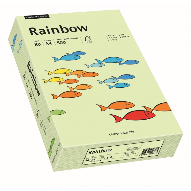 Papier ksero kolorowy Rainbow /72/ blado zielony A4, 80 g inspirujący asortyment bezdrzewnego, barwionego w masie papieru niepowlekanego w szerokiej gamie kolorystycznej dedykowany do zastosowań biznesowych: korespondencja, ulotki, zaproszenia, jak również do wszelkich kreatywnych realizacji Rainbow® pakowany jest w eleganckie, przyciągające wzrok, przezroczyste opakowanie posiada gwarancję jakości preprint dla gramatur 80 - 160 g/m2 jednostka sprzedaży 1 ryzaSpecyfikacja