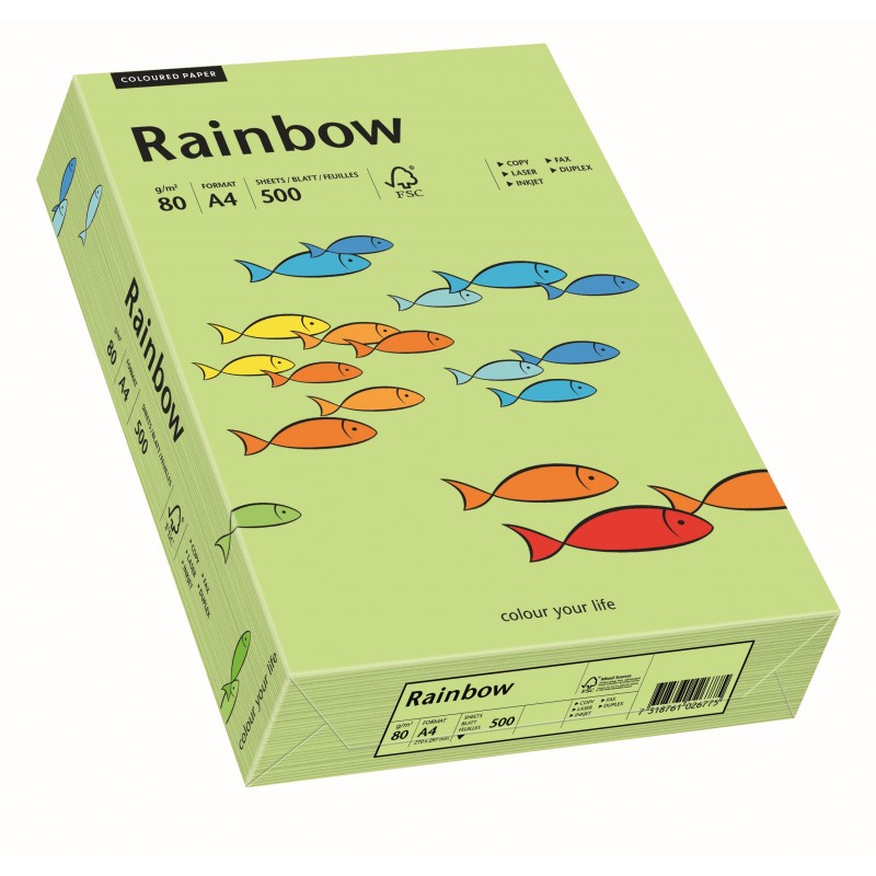 Papier ksero kolorowy Rainbow /74/ j.zielony, A4, 80 g, inspirujący asortyment bezdrzewnego, barwionego w masie papieru niepowlekanego w szerokiej gamie kolorystycznej dedykowany do zastosowań biznesowych: korespondencja, ulotki, zaproszenia, jak również do wszelkich kreatywnych realizacji Rainbow® pakowany jest w eleganckie, przyciągające wzrok, przezroczyste opakowanie posiada gwarancję jakości preprint dla gramatur 80 - 160 g/m2 jednostka sprzedaży 1 ryzaSpecyfikacja